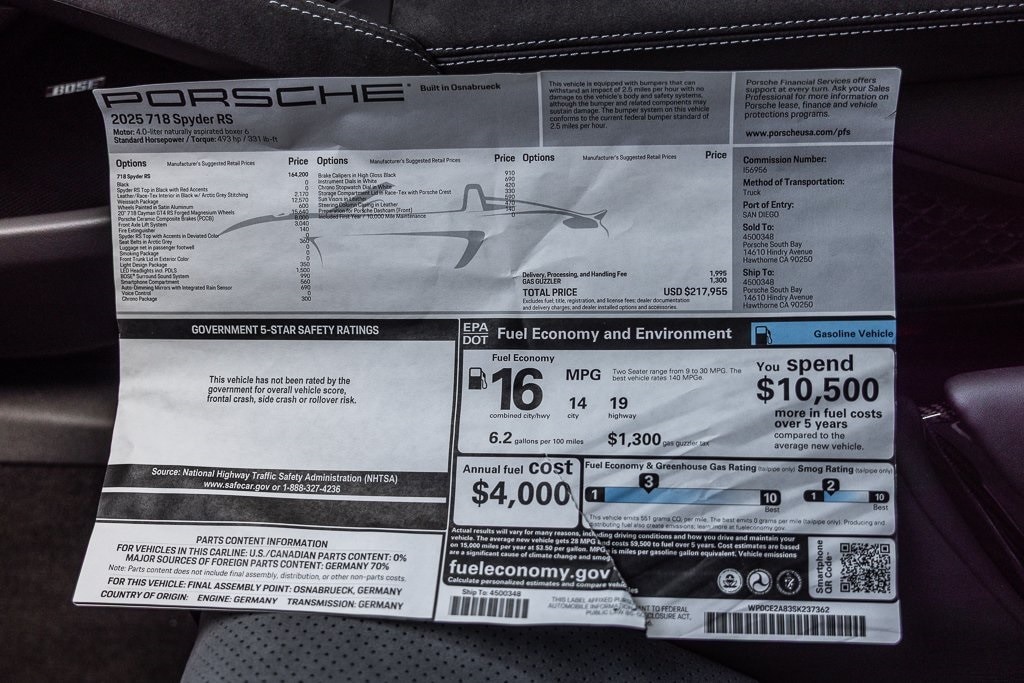 Porsche South Bay is thrilled to offer this exceptional. 2025 Porsche 718 Spyder RS Black Certified. ABS brakes, Alloy wheels, Electronic Stability Control, Front dual zone A/C, Heated door mirrors, Illuminated entry, Low tire pressure warning, Navigation System, Porsche Communication Management, Remote keyless entry, Traction control. RWD 7-Speed Porsche Doppelkupplung (PDK) 4.0L H6 DOHC 24V LEV3-ULEV70 493hp